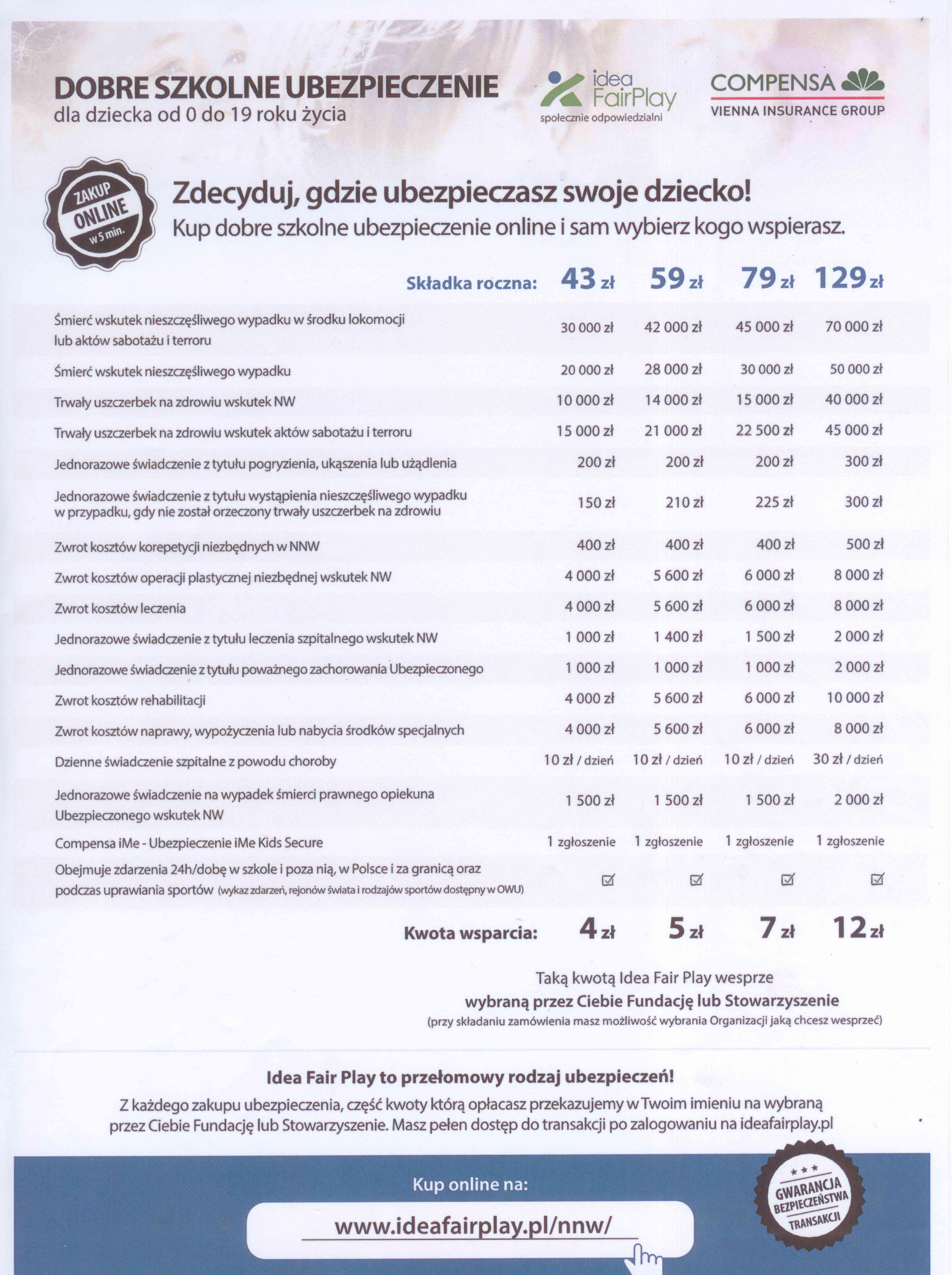 Informujemy, że w bieżącym roku szkolnym szkoła nie będzie pośredniczyła w ubezpieczaniu uczniów od następstw nieszczęśliwych wypadków. Podczas najbliższego spotkania z rodzicami, które będzie miało miejsce 21 września br., będą natomiast obecni przedstawiciele 3 firm ubezpieczeniowych, którzy przedstawią Państwu swoje oferty i z którymi będzie można zawrzeć na miejscu stosowne umowy. W załączeniu przedstawiamy dwie z tych ofert. Zobacz TU>> i TUTAJ>>
