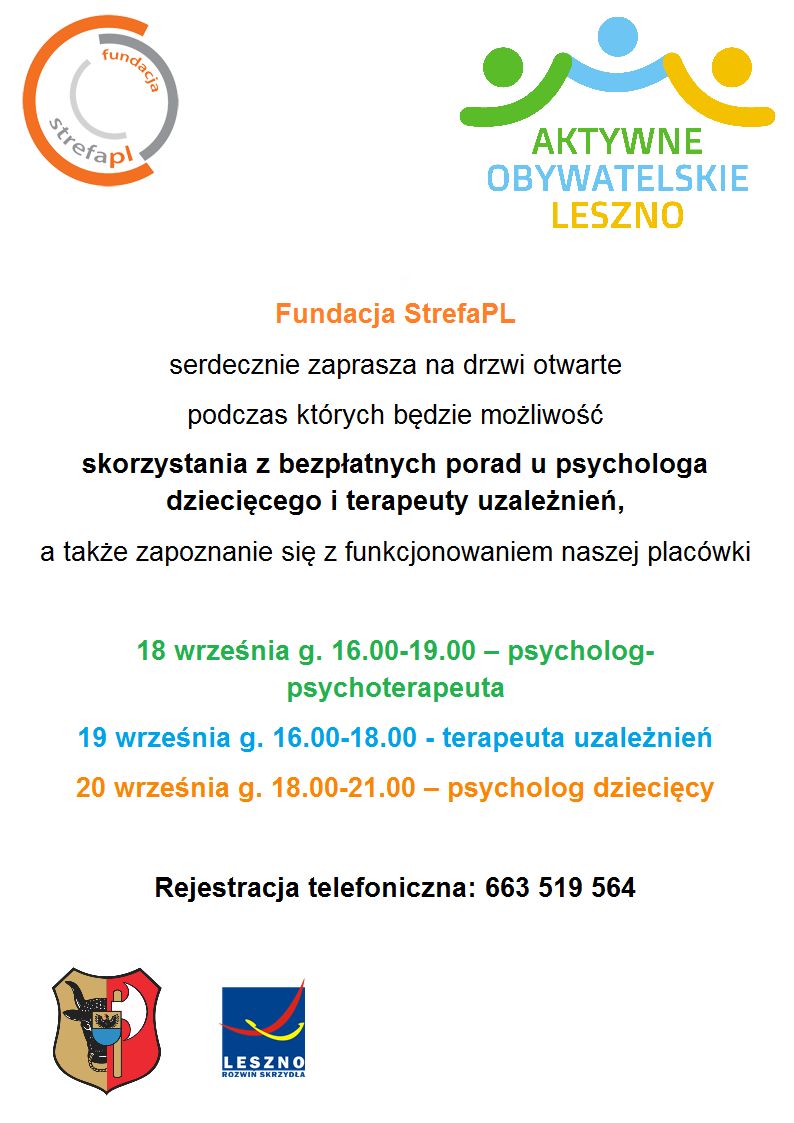 W ramach Aktywnego Obywatelskiego Leszna zapraszamy do skorzystania z bezpłatnych porad psychologa, psychologa dziecięcego oraz terapeuty uzależnień (ze szczególnym uwzględnieniem porad dotyczących nadużywania przez dzieci urządzeń mobilnych). Konsultacje prowadzić będą psychologowie i terapeuci specjalizujący się w pracy z dziećmi, młodzieżą, prowadzący na co dzień poradnictwo w zakresie metod wychowawczych i radzenia sobie w sytuacjach trudnych wychowawczo. W razie potrzeby istnieje możliwość kontynuacji spotkań z psychologiem i pracy nad zgłoszonym problemem. Świadczona pomoc jest bezpłatna i współfinansowana przez Miasto Leszno. Daty i godziny dyżurów znajdują sie na plakacie informacyjnym>>. Spotkania odbywać się będą w Centrum Profilaktyki AKADEMIA ZDROWIA przy ulicy Średniej 11 w Lesznie. Obowiązuje rejestracja telefoniczna.